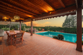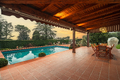 Die Außenbereiche runden das Angebot mit einer großen überdachten Veranda mit Blick auf den Pool, einem Grillbereich mit Kamin sowie einem weiteren überdachten Ruhebereich ab, der in das Grün des privaten Parks eingebettet ist.