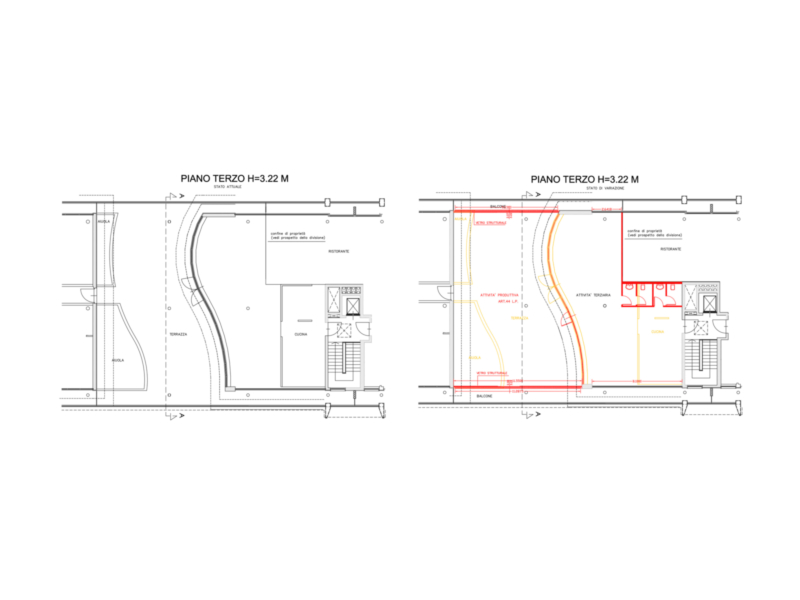 Die Kubatur befindet sich im vierten und obersten Stockwerk. Das Projekt sieht die Schließung der Terrasse vor, um eine Gewerbefläche von ca. 200 m² mit Innenhöhen zwischen 3,20 und 3,60 m, je nach der gewählten Konstruktionslösung, zu schaffen.