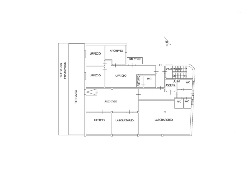 - Obergeschoss (ca. 290 m² - H ca. 3,00 m): Büros und Labor, verbunden mit einer 80 m² großen Terrasse, die sich ideal als externer Versammlungsort eignet.