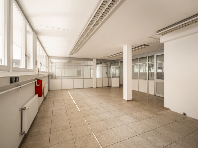 Erdgeschoss (ca. 380 m² – h ca. 3,40 m): Werkstatt/Labor mit Lager und Sanitäranlagen. Derzeit als Open Space konzipiert und daher flexibel teilbar.