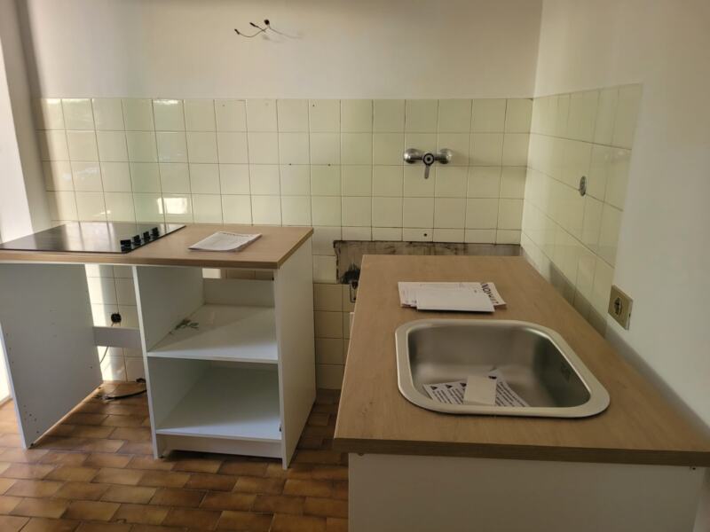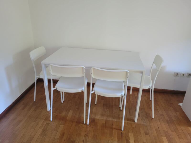 Neue, komplett eingerichtete Küche: Küche + Esstisch, Herd, Kochfeld, Kühlschrank, Tisch, Stühle