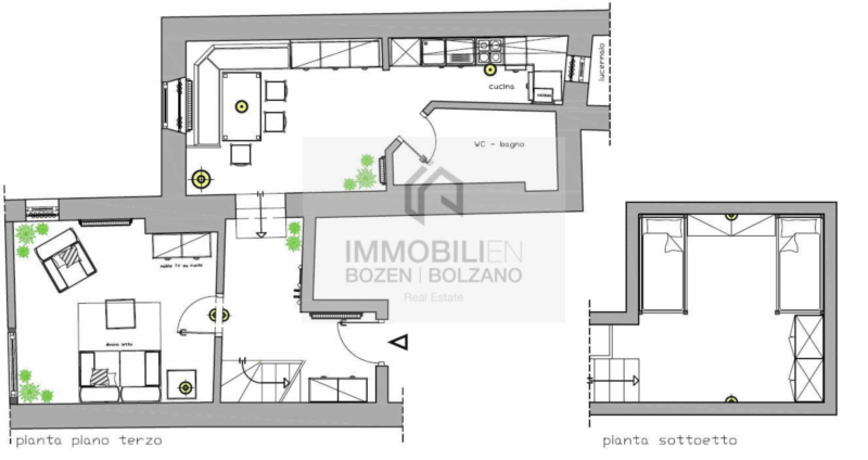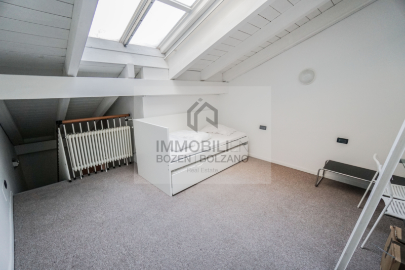 Die möblierte 3-Zimmerwohnung liegt im 3. & 4. Stock eines Kondominiums in Zentrum von Bozen. Die Immobilie ist auf 2 Etagen aufgeteilt, verfügt über: einem Eingangsbereich, einem Wohnzimmer mit Kochnische, zwei Schlafzimmer (eines davon befindet sich im oberen Stock ohne Tür) und einem Badezimmer. Sie wird vollmöbliert übergeben. Kein Balkon und kein Autostellplatz vorhanden. Heizung und Wasser sind autonom.