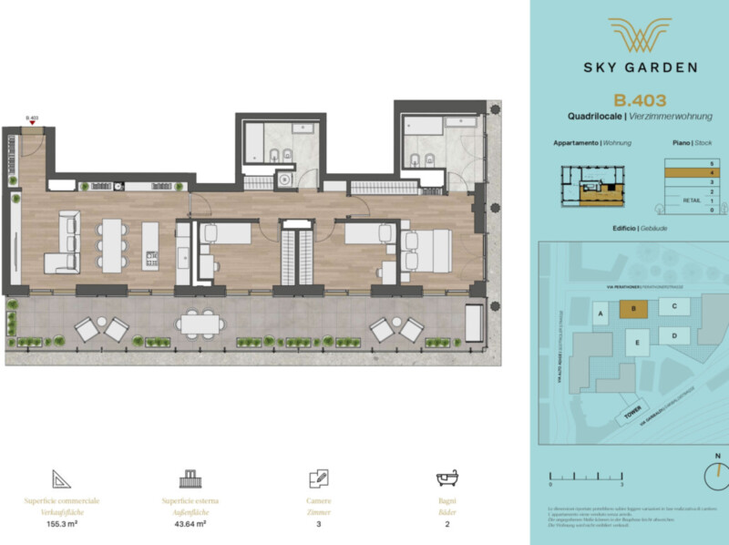 WOHNUNG B403 - Sky Garden B: Zum Verkauf steht eine neue, große Vierzimmerwohnung mit Terrasse im 4. OG - interne Einteilung wie folgt: Eingang, Wohnraum mit Küche, 3 Schlafzimmer, 2 Badezimmer und Terrasse.