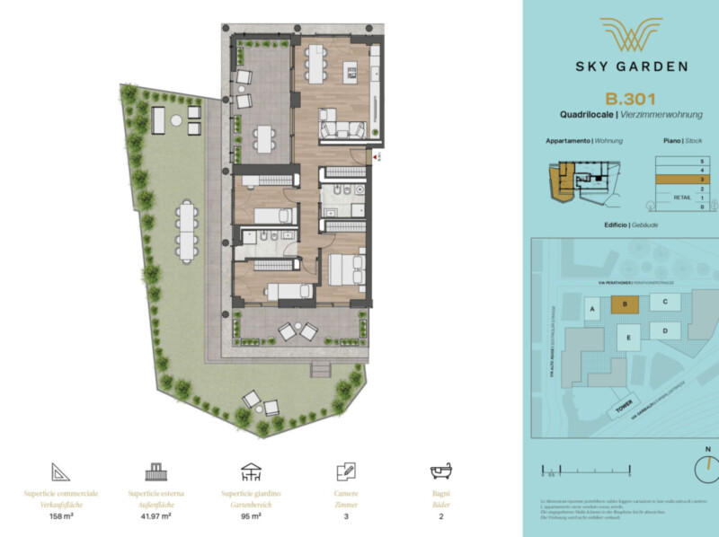 WOHNUNG B301 - Sky Garden B: Zum Verkauf steht eine neue, schöne Vierzimmerwohnung mit Terrasse und Privatgarten im 3. OG - interne Einteilung wie folgt: Eingang, Wohnraum mit Küche, 3 Schlafzimmer, 2 Badezimmer, Terrasse und Privatgarten.