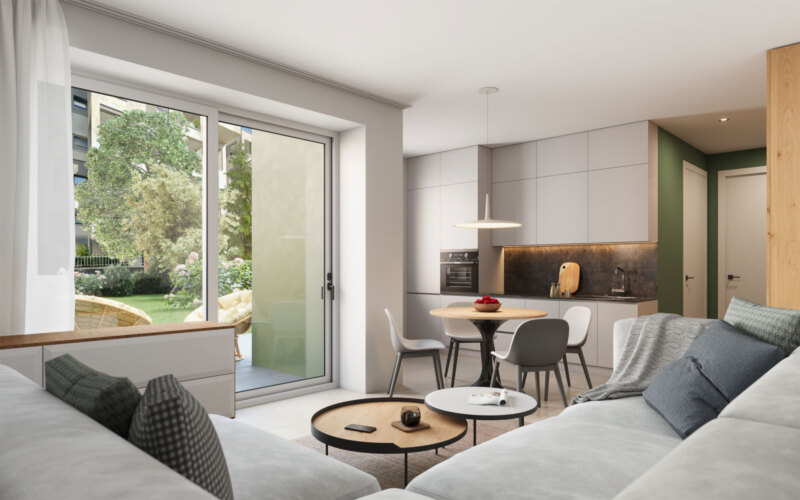 Etwas zurückversetzt von der Straße, überzeugt die Wohnanlage durch Ruhe, Privatsphäre und ein durchdachtes Raumkonzept. Jede Einheit verfügt über großzügige Außenflächen, mit Garten oder geschützter Loggia.