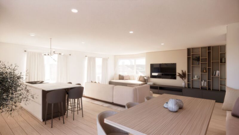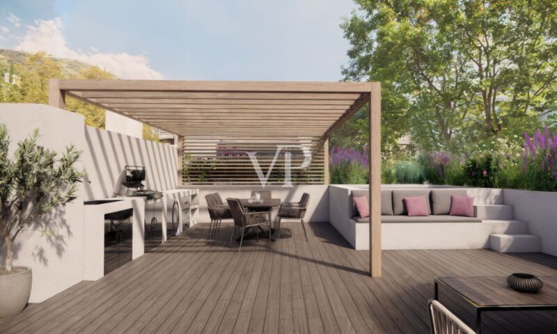 Der Schlafbereich umfasst zwei komfortable Doppelschlafzimmer, beide mit Zugang zu einem zweiten, mehr als 10 m² großen Balkon, ein stilvolles Arbeitszimmer, zwei großzügige Badezimmer sowie ein geschickter Abstellraum. Eine elegante Innentreppe führt auf die 65 m² große Dachterrasse – ein echtes Panorama-Penthouse mit Außenküche, Whirlpool oder Schwimmbad und gemütlicher Lounge-Zone. Wie in den Projekt-Renderings dargestellt, entsteht hier ein exklusiver Rückzugsort für Entspannung und Geselligkeit.