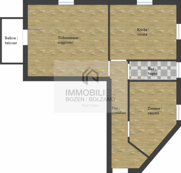 Die Wohnfläche gliedert sich in einen Eingangsbereich mit Flur, eine separate Wohnküche, ein Wohnzimmer mit Balkon, ein Schlafzimmer sowie ein Badezimmer mit Fenster. Zur Wohnung gehören außerdem ein Keller und ein Dachboden, die zusätzlichen Stauraum bieten. Im Innenhof des Kondominiums stehen gemeinschaftlich Autostellplätze zur Verfügung.