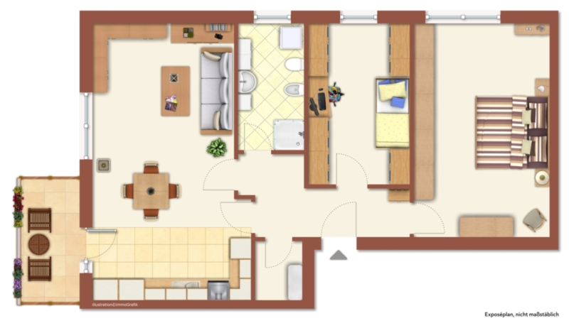 Die Wohnung ist funktional und durchdacht geschnitten und erstreckt sich über ca. 62 m². Sie verfügt über zwei Schlafzimmer, ein Badezimmer sowie einen großzügigen Wohn- und Essbereich mit offener Küche. Vom Wohnzimmer aus besteht ein direkter Zugang zum Balkon, der zusätzlichen Wohnkomfort im Außenbereich bietet. Ergänzt wird das Raumangebot durch eine Garderobe sowie einen praktischen Abstellraum.