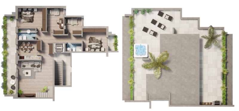 Das Objekt verfügt über eine große Dachterrasse und Balkone mit insgesamt ca. 160 m², ideal für große Familien. Es besteht aus 5 Zimmern, einer Wohnküche, 2 Badezimmern, Keller und 2 grosse Garagen extra (nicht im Preis inbegriffen), was maximalen Komfort garantiert.