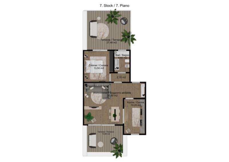 Zum Verkauf steht ein elegantes Penthouse im siebten Stock, ideal für Paare und als Pied-à-Terre für alle, die Bozen von seiner besten Seite erleben möchten. Die Wohnung öffnet sich zu einem Foyer, das zu einem hellen Wohnzimmer und einer Wohnküche führt, die auf Komfort und Funktionalität ausgelegt sind. Der Flur verbindet den Wohnbereich mit dem Badezimmer mit Fenster und dem geräumigen Hauptschlafzimmer, was Privatsphäre und Entspannung garantiert. Das Highlight sind die beiden großen Terrassen mit insgesamt 42 m², die einen herrlichen Panoramablick bieten und ideal sind, um das Leben im Freien zu genießen perfekt für Mittag- und Abendessen oder einfach zum Entspannen mit Blick auf die Stadt. Das Penthouse ist mit hochwertigen Oberflächen ausgestattet und bietet die Möglichkeit, Materialien individuell zu wählen, um ein maßgeschneidertes, elegantes und modernes Ambiente zu schaffen. Möglichkeit zum Garagenkauf