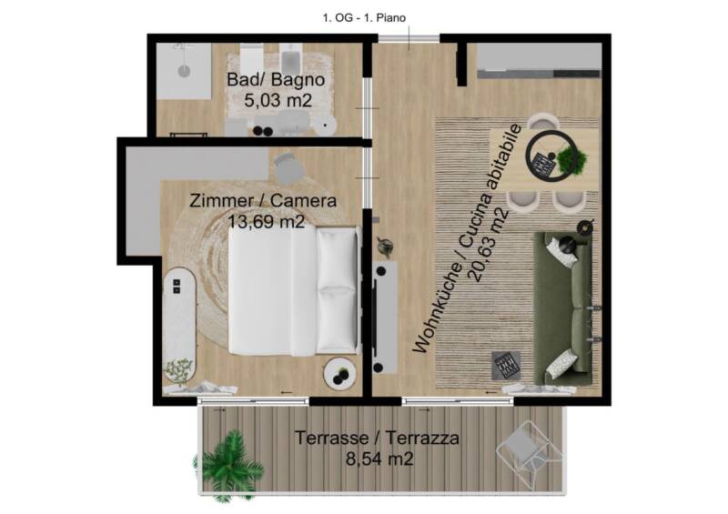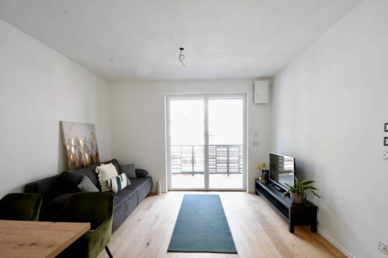 Die Wohnung verfügt über eine Terrasse, die sowohl vom Schlafzimmer als auch von der Wohnküche aus zugänglich ist. Sie bietet die Möglichkeit, frische Luft zu genießen und die Wohnung um einen Außenbereich zu erweitern.