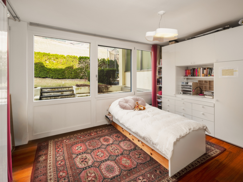 Im Obergeschoss befinden sich drei helle Schlafzimmer, eines davon mit eigenem Balkon, zwei stilvoll ausgestattete Badezimmer sowie ein gemütliches Fernsehzimmer. Ergänzt wird diese Etage durch eine weitere Terrasse mit Gartenanteil. Das Untergeschoss überzeugt mit einem vielseitig nutzbaren Raum, einem separaten WC, einem Keller sowie einem direkten Zugang zur großzügigen Doppelgarage.