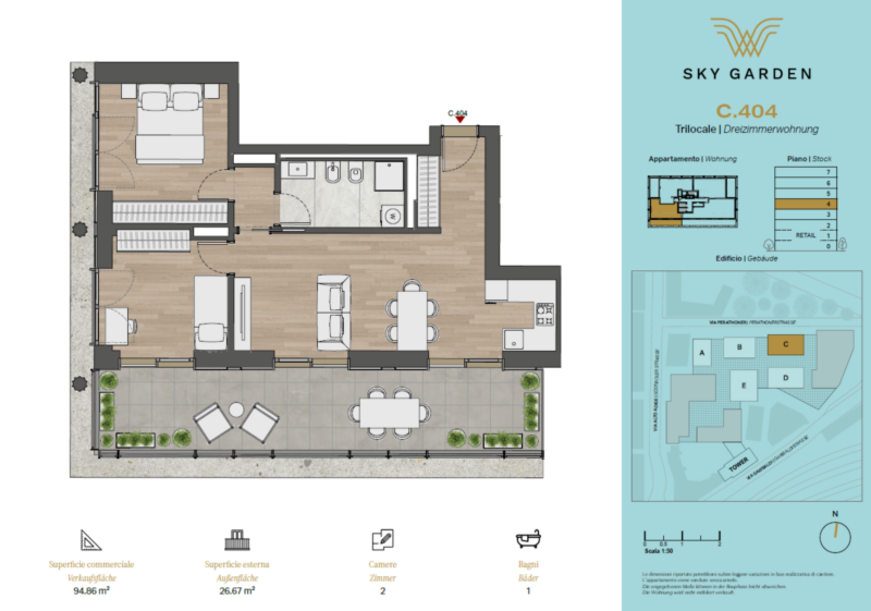 Wohnen Sie das Leben im Herzen von Bozen in einem exklusiven 3-Zimmer-Wohnung im 4. Stock des WaltherPark, dem neuen Gebeudekomplex, der das gesamte Viertel aufwertet und modernisiert. Das Apartment wurde nach dem Standard KlimaHaus A Nature errichtet und vereint Komfort, Nachhaltigkeit und modernes Design.
