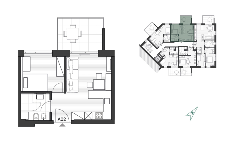 Zweizimmerwohnung mit Wohnküche, einem Schlafzimmer, einem Badezimmer und einem Balkon. Im Untergeschoss verfügt die Wohnung über einen Keller, während ein Autostellplatz separat erworben werden kann.