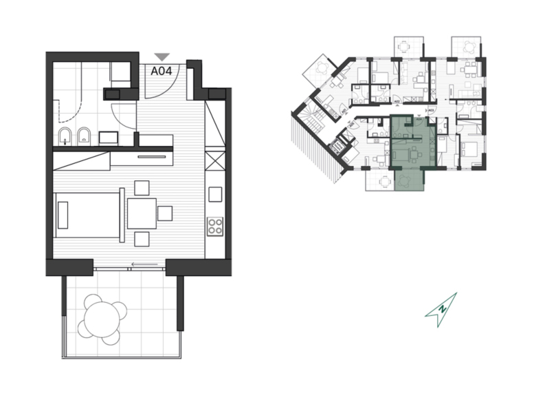 Konventionierte Einzimmerwohnung mit Wohnraum, Badezimmer und Balkon. Im Untergeschoss verfügt die Wohnung über einen Keller, während ein Autostellplatz separat erworben werden kann.