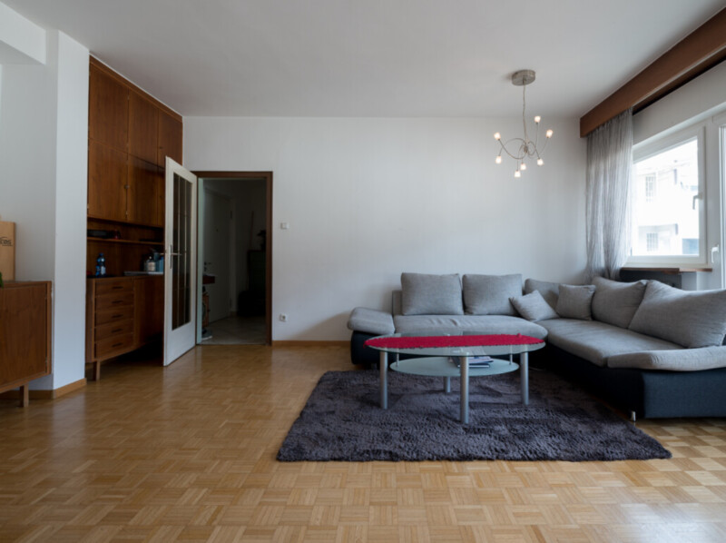 Die Wohnung befindet sich im 2. Stock und ist wie folgt eingeteilt: Eingang, Wohnzimmer, Küche, 2 Schlafzimmer, Abstellraum, Bad und 2 Balkone.