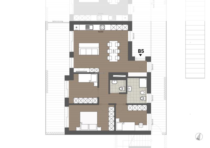 Diese 4-Zimmerwohnung im 1. Obergeschoss umfasst einen Eingangsbereich, Wohn- und Essbereich, drei Schlafzimmer und zwei Badezimmer.