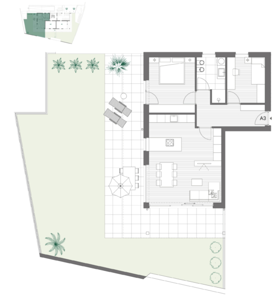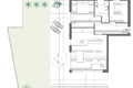 Diese Dreizimmerwohnung besteht aus einer geräumigen Wohnküche, zwei Schlafzimmern, einem Badezimmer, einer Terrasse mit Garten und einem Keller.