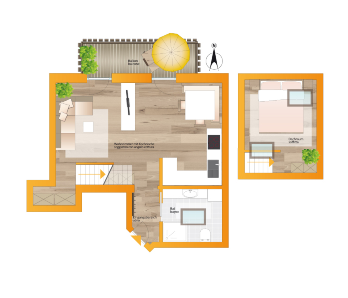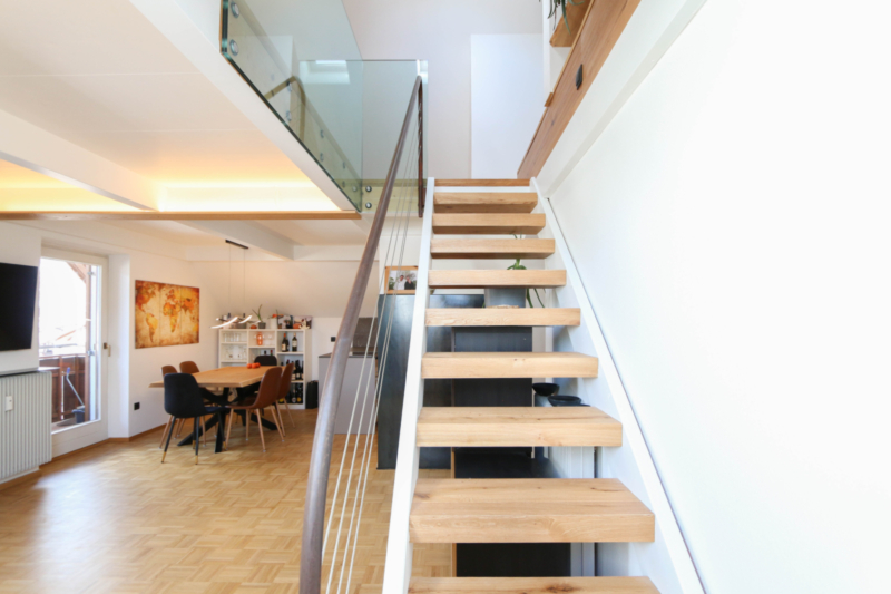 Ein Highlight ist der ausgebaute Dachraum mit Schlafgelegenheit, der den typischen Loftcharakter unterstreicht und ein behagliches, zugleich architektonisch reizvolles Wohngefühl schafft. Das geschmackvoll gestaltete Badezimmer entspricht modernsten Standards und fügt sich nahtlos in das hochwertige Gesamtkonzept ein. Der Balkon bietet zusätzlichen Freiraum und lädt zum Entspannen ein. Die Wohnung wird vollständig möbliert (Ausnahme Bett) übergeben.