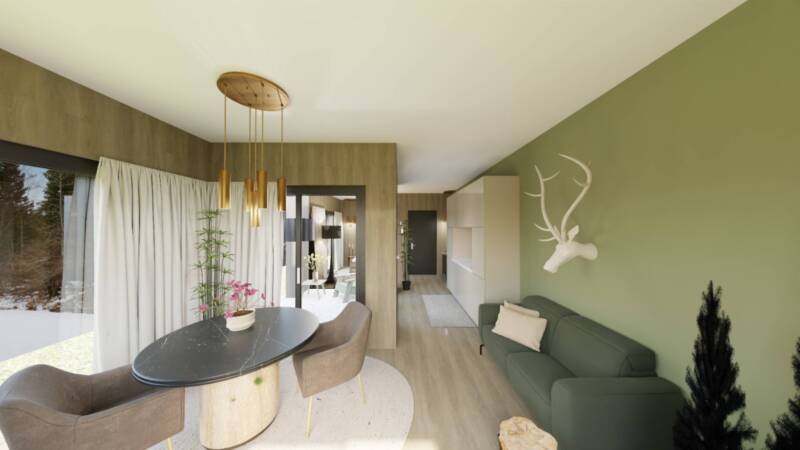 Das Projekt sieht ein hochwertiges Chalet in moderner Holzbauweise vor, perfekt eingebettet in die natürliche Umgebung. Großzügige Glasflächen sorgen für lichtdurchflutete Räume und reizvolle Ausblicke auf den angrenzenden Wald. Im Erdgeschoss befinden sich ein offener Wohnbereich mit Küche und Zugang zur Terrasse, ein Schlafzimmer sowie ein modernes Badezimmer mit Dusche. Das Untergeschoss bietet zusätzliche Flächen mit vielfältigen Nutzungsmöglichkeiten ideal für Wellness, Hobbyräume, Gästezimmer oder individuell gestaltete Bereiche.