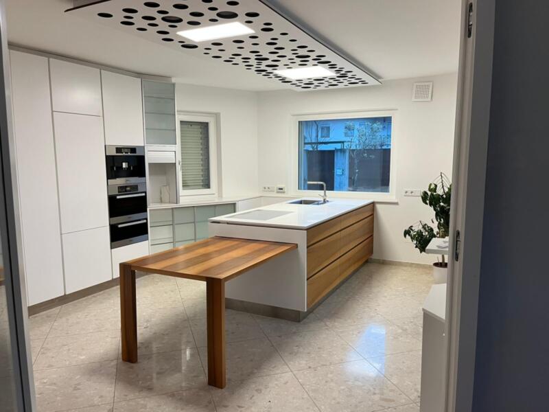 Das Erdgeschoss beeindruckt mit einer offenen Raumgestaltung. Eine elegante Küche, ein stilvoller Wohn- und Essbereich sowie ein funktionales Arbeitszimmer bilden das Herzstück des Hauses – ideal für gesellige Abende oder produktives Arbeiten.