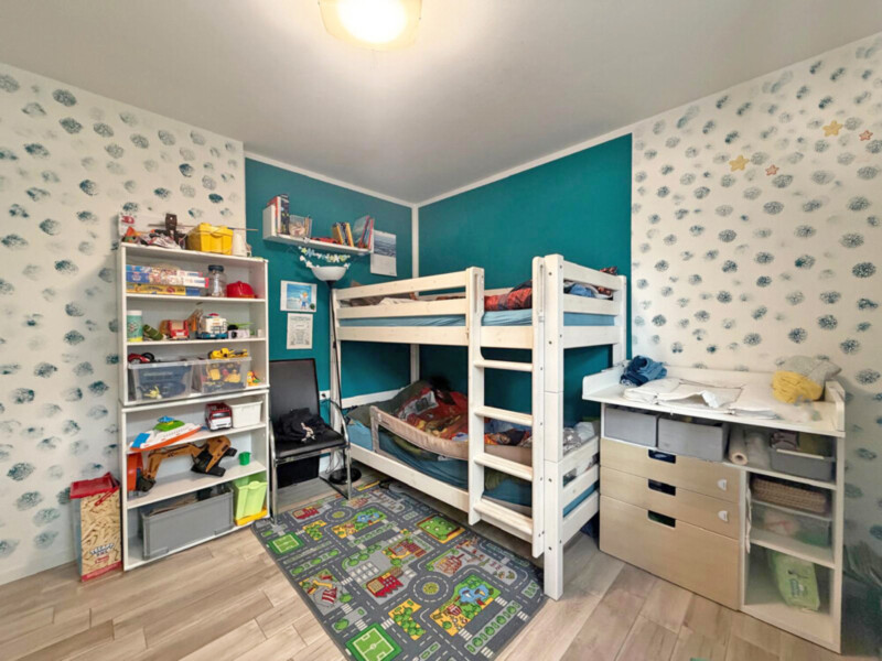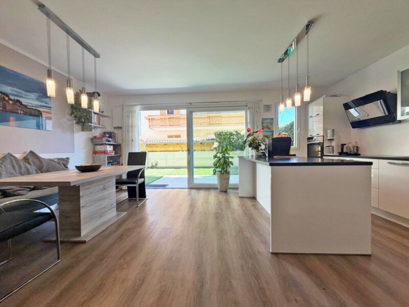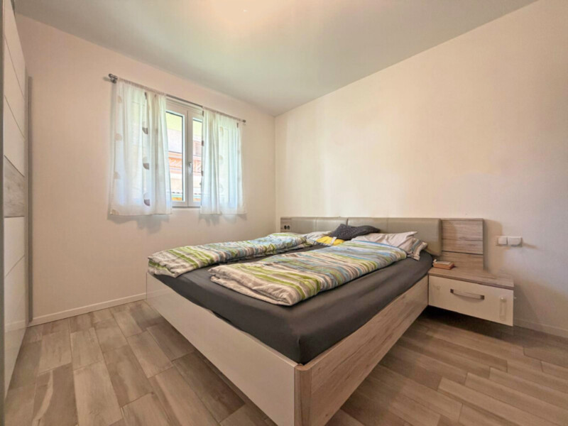 Die Immobilie unterteilt sich in zwei Schlafzimmer, eine großzügige und helle Wohnküche mit Abstellraum, ein Badezimmer mit Fenster und Dusche sowie eine Terrasse mit angrenzendem Privatgarten. Ergänzt wird das Angebot durch zwei Kellerräume.