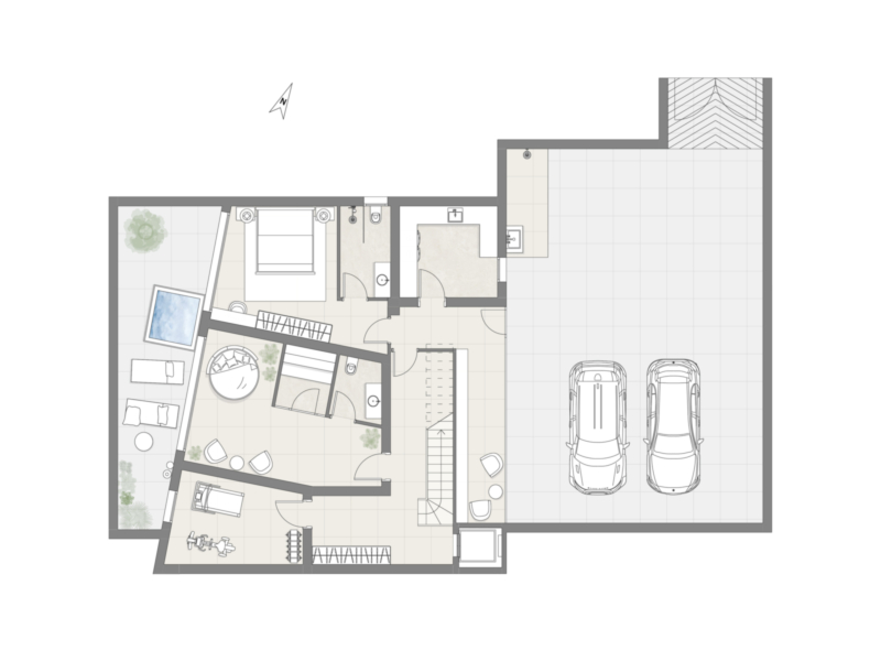 Im Untergeschoss befindet sich eine großzügige Garage mit direktem Zugang zu einem verglasten Weinkeller – ein besonderes Detail für Weinliebhaber.