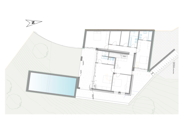 Im Erdgeschoss befinden sich zwei Schlafzimmer, drei moderne Badezimmer, ein praktischer Waschraum sowie zwei großzügige, beheizte Räume, die vielseitig nutzbar sind – beispielsweise als Fitnessraum, Hobbyraum oder Homeoffice. Ergänzt wird das Raumangebot durch einen Technikraum, eine überdachte Loggia, den liebevoll angelegten Garten sowie einen privaten Swimmingpool mit Blick auf den See.