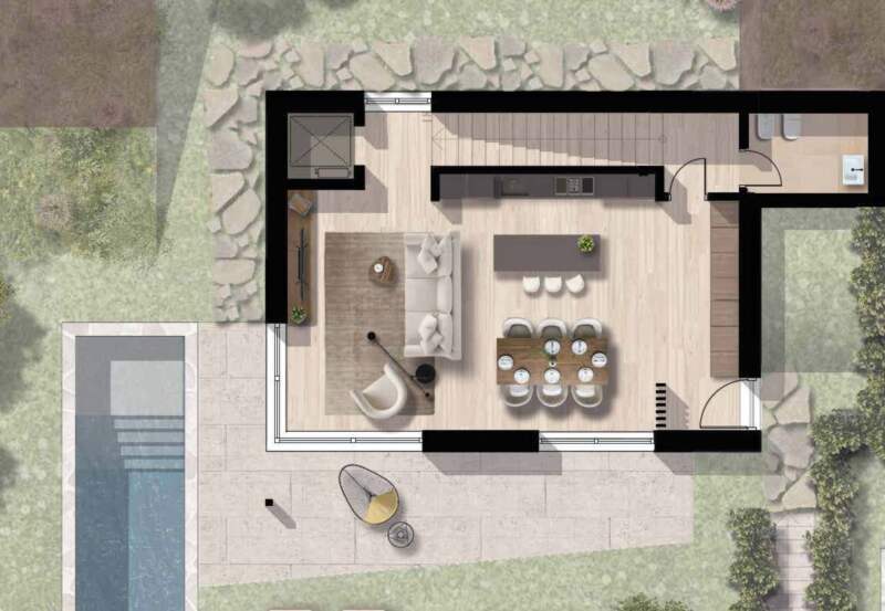 Die Villa verfügt über eine private Garage, Technikräume sowie eine elegante Eingangsgarderobe, die entweder zur internen Treppe oder zum privaten Aufzug führt und somit einen komfortablen Zugang zu den oberen Etagen ermöglicht.
