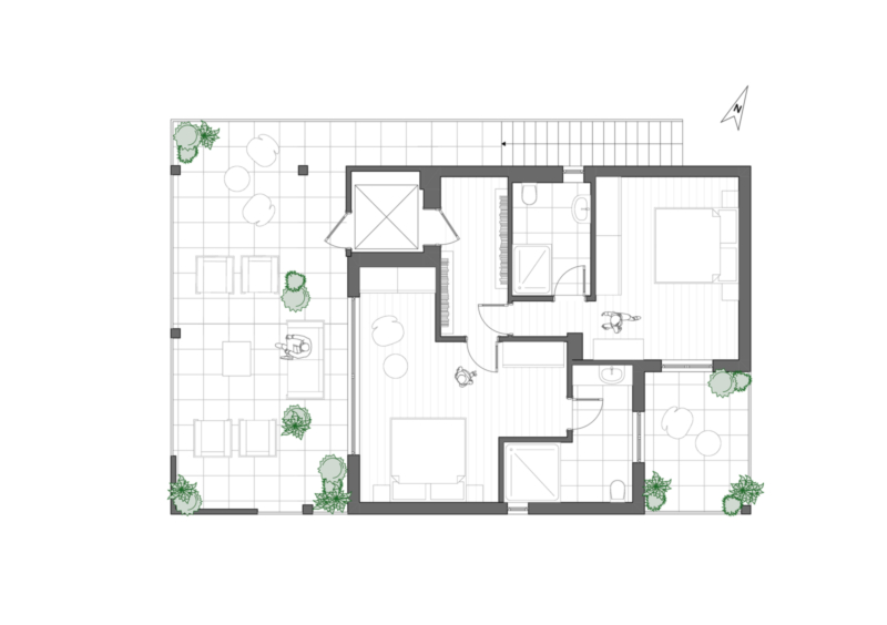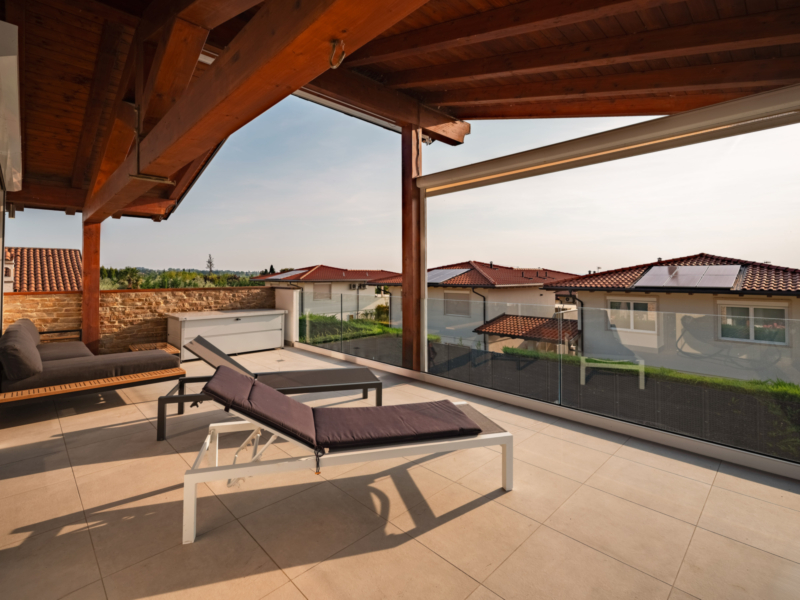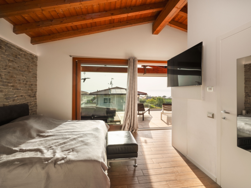 Im oberen Geschoss, das sowohl über einen Aufzug als auch vom Außenbereich erreichbar ist, befinden sich zwei elegante Schlafzimmer. Das erste Schlafzimmer verfügt über ein modernes en-suite Badezimmer sowie einen eigenen Balkon mit Blick auf den See, ideal für Morgengymnastik oder gemütliche Abende im Freien. Das zweite Schlafzimmer bietet ebenfalls Seeblick und Zugang zu einer großen Terrasse, auf der man die Sonne und die schöne Landschaft genießen kann.