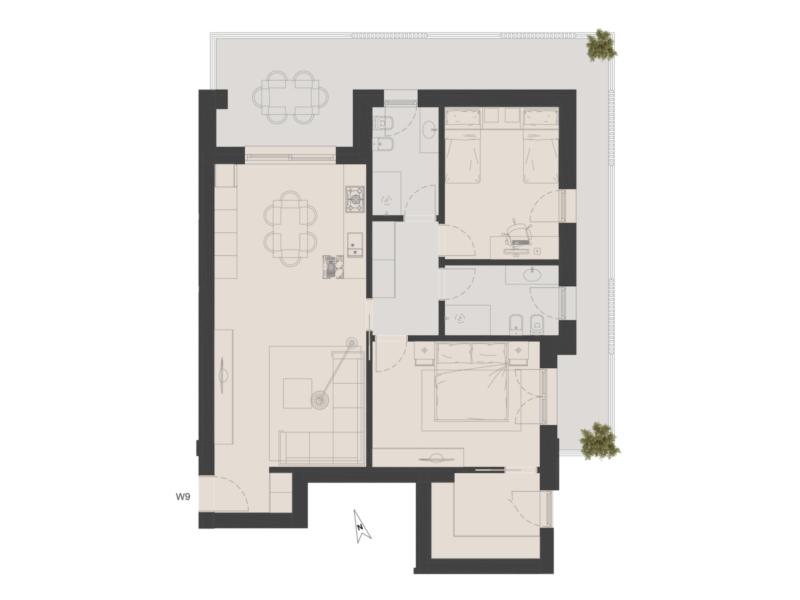 Die Dreizimmerwohnung, mit einer große Terrasse, ideal für Mahlzeiten und Entspannung, verfügt über einen großzügigen Wohnraum mit offener Küche und herrlichem Seeblick.