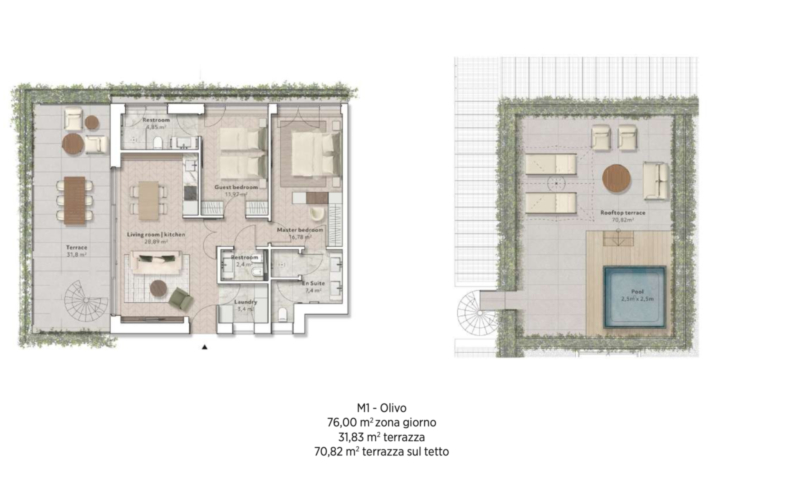 Die Penthäuser verfügen über großzügige Sonnenterrassen und bieten die Möglichkeit eines Dachpools.