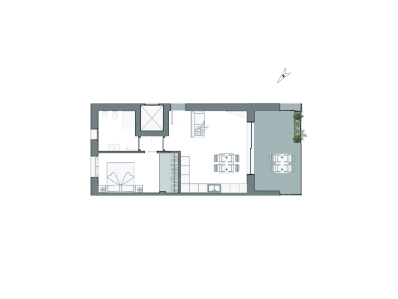 Diese 2-Zimmer-Terrassenwohnung mit privater Dachterrasse verfügt über eine Wohnküche, ein Schlafzimmer sowie ein Badezimmer.