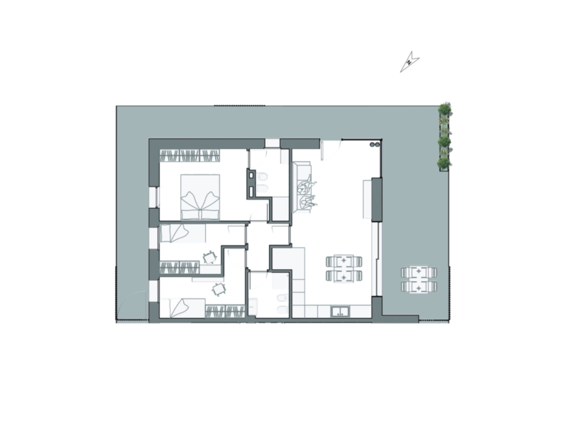 Die Architektur ist klar und zeitlos, mit großen Glasfronten und hochwertigen Materialien. Das Gebäude hat zwei Etagen sowie eine Tiefgarage und ist durch einen modernen Aufzug barrierefrei zugänglich. Jede Wohnung hat einen großzügigen Außenbereich, entweder einen privaten Garten im Erdgeschoss oder große Terrassen und ein exklusives Dachsolarium für die Wohnungen im Obergeschoss.