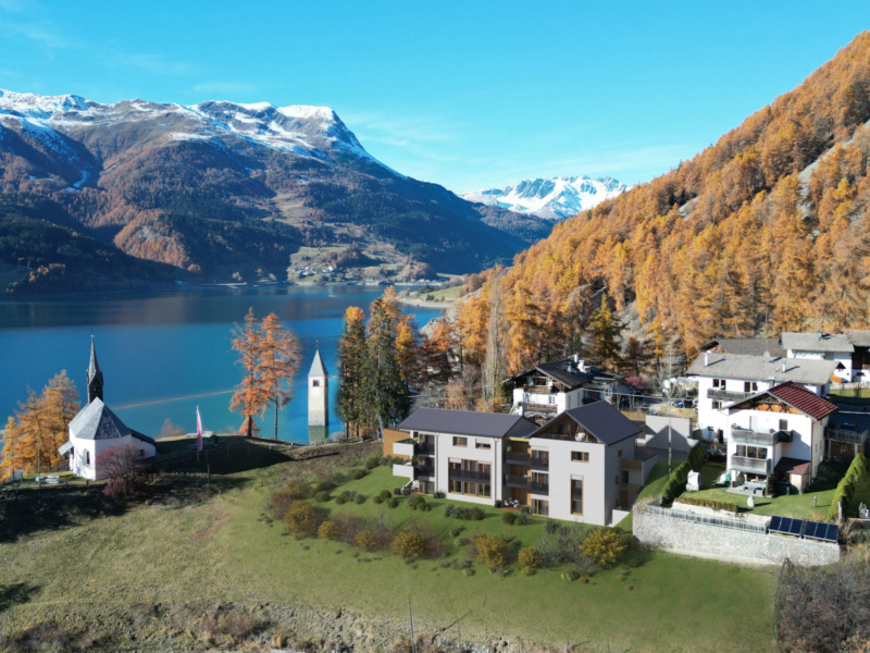 Der berühmte Kirchturm im Reschensee prägt das Panorama der Umgebung und unterstreicht die Einzigartigkeit dieser besonderen Wohnlage.