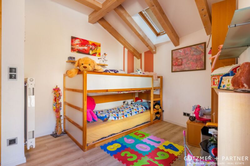Im ersten Obergeschoss befinden sich drei einladende Schlafzimmer mit Zugang zu einem Balkon mit Panoramablick auf die Mendel sowie ein großes Badezimmer mit Badewanne, das höchsten Komfort bietet.