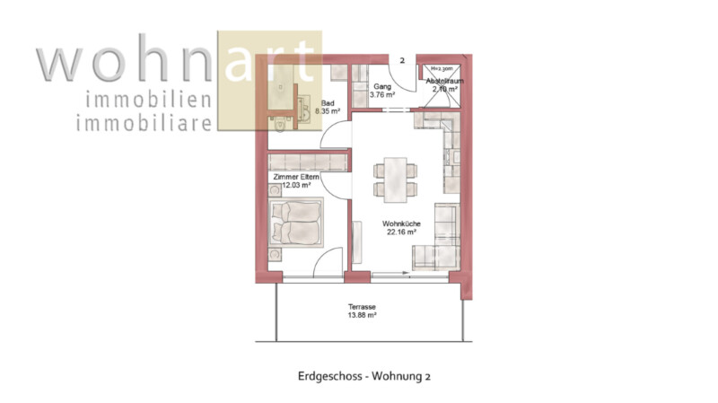 Zum Verkauf steht eine Zweizimmerwohnung im Erdgeschoss. Sie verfügt über einen gemütlichen Wohnbereich, ein Schlafzimmer, ein großzügiges Badezimmer sowie einen praktischen Abstellraum. Eine Terrasse rundet dieses attraktive Angebot ab.