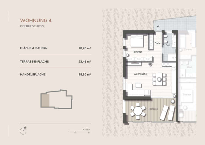 Alle Wohnungen überzeugen durch eine optimale Südausrichtung mit sonnigen Südterrassen, die zusätzlichen Wohnraum im Freien bieten und einen freien Blick auf die umliegende Berglandschaft ermöglichen.