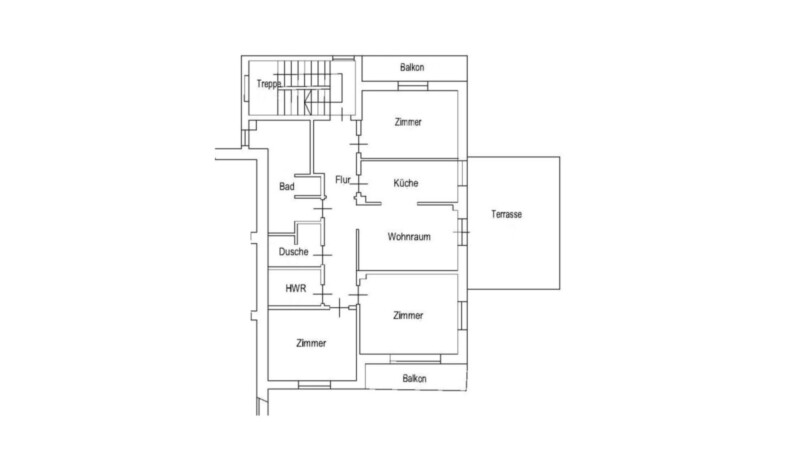 Sie setzt sich aus Flur, Wohnraum, Kochnische, drei Zimmern, Bad-Dusche-WC, Dusche-WC, Abstellraum, zwei Balkonen und Terrasse zusammen.