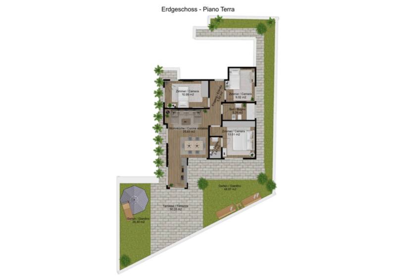 Diese im Erdgeschoss gelegene Wohnung in einem Neubau in Steinmannwald bei Leifers bietet großzügige Innen- und Außenbereiche in absoluter Ruhe. Das Highlight ist ein wunderschöner Privatgarten von ca. 120 m² ideal für entspannte Stunden im Freien, als Spielplatz für Kinder, für Gartenliebhaber oder einfach zum Abschalten. Dazu kommt eine großzügige, über 50 m² große Terrasse in perfekter Ausrichtung, die direkt vom Wohnbereich aus zugänglich ist ideal für Mittag- und Abendessen im Freien oder um Sonne und Ausblick zu genießen. Die Wohnung besteht aus einem praktischen Eingangsbereich, einem großzügigen Wohnzimmer mit Kochnische, drei Schlafzimmern, zwei Bädern sowie einem privaten Keller. Sie befindet sich in einem gepflegten, ruhigen Wohnkontext und nur wenige Minuten von Bozen entfernt. Ein ideales Zuhause für Familien, Paare oder Naturliebhaber, die in einer ruhigen Umgebung mit viel Platz im Freien leben möchten, ohne auf die Nähe zu den städtischen Dienstleistungen zu verzichten. Es besteht die Möglichkeit, eine Einzelgarage, eine Doppelgarage oder einen überdachten Stellplatz separat zu erwerben.