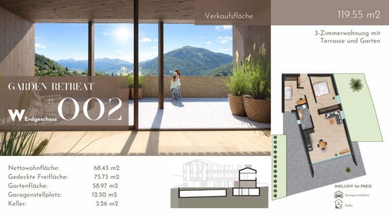 Mit einem privaten Garten von rund 140 m² entsteht ein großzügiger Außenbereich, der den Wohnraum harmonisch erweitert und vielseitige Nutzungsmöglichkeiten bietet. Die Wohnung verfügt über zwei Schlafzimmer, ein stilvolles Badezimmer sowie einen offenen Wohnbereich mit integrierter Küche. Großzügige Glasflächen sorgen für helle Räume und schaffen fließende Übergänge zwischen Innen- und Außenbereich.