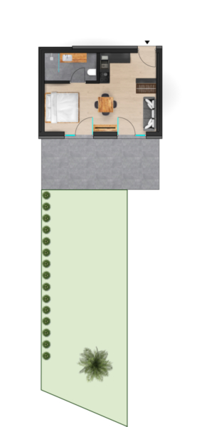 Die Wohnung verfügt über einen offenen Wohn- und Schlafbereich mit integrierter Küche sowie ein modernes Badezimmer. Großzügige Glasflächen sorgen für viel Tageslicht und schaffen eine direkte Verbindung zum privaten Garten mit rund 50 m², der den Wohnraum spürbar erweitert.