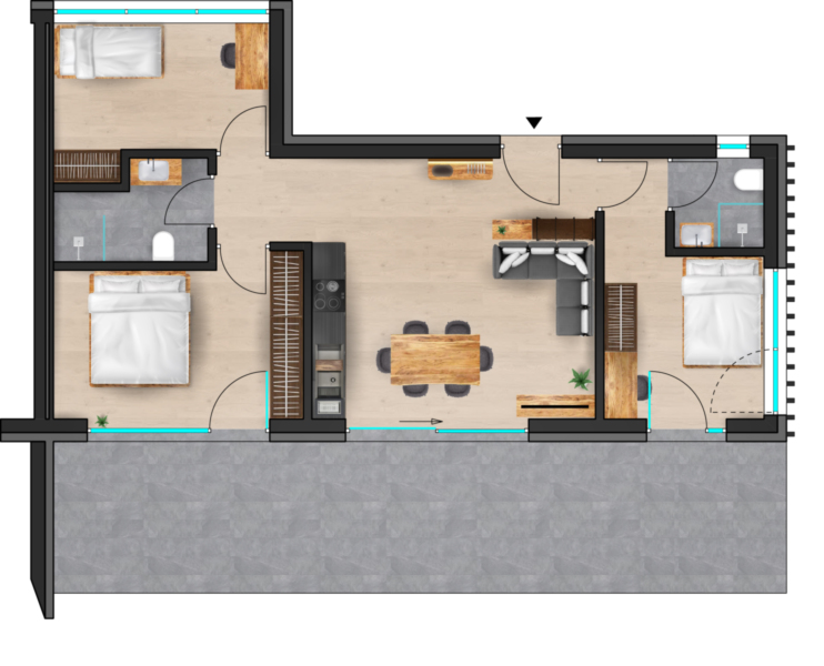 Der offen gestaltete Wohn- und Essbereich mit integrierter Küche verfügt über einen direkten Zugang zur Terrasse und schafft eine fließende Verbindung zwischen Innenraum und Außenbereich. Auch zwei der Schlafzimmer sind zur Terrasse hin orientiert und profitieren von Licht, Weite und Ausblick.