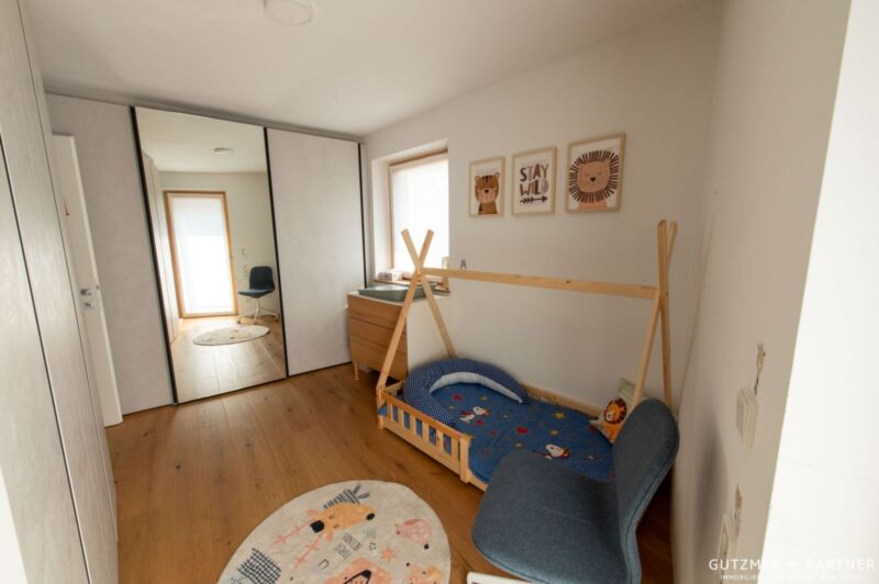 Im Erdgeschoss mit einem großzügigen Wohnzimmer + integrierter Wohnküche, Gäste-WC, und direktem Zugang zum Garten und zur Terrasse. Im Obergeschoss befinden sich zwei Schlafzimmer, eines davon mit einer eleganten Badewanne free-standing, sowie ein Badezimmer mit Dusche für höchsten Komfort.