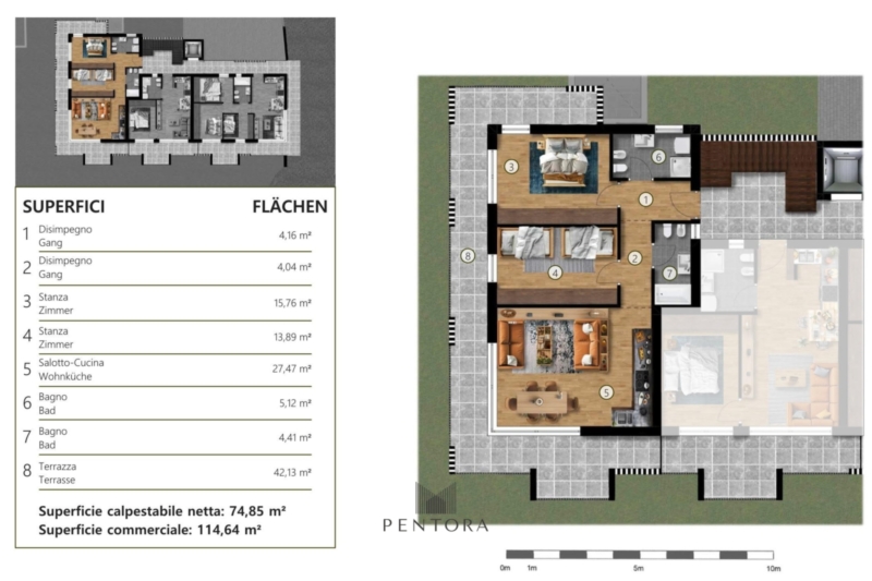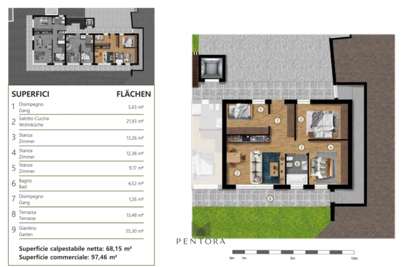 In einem der schönsten Viertel Merans entstehen moderne Neubauwohnungen, die durch großzügige Raumaufteilung und weitläufigen Terrassen überzeugen. Die Lage zeichnet sich durch ihre Nähe zum Stadtzentrum aus, das in wenigen Minuten zu Fuß erreichbar ist.