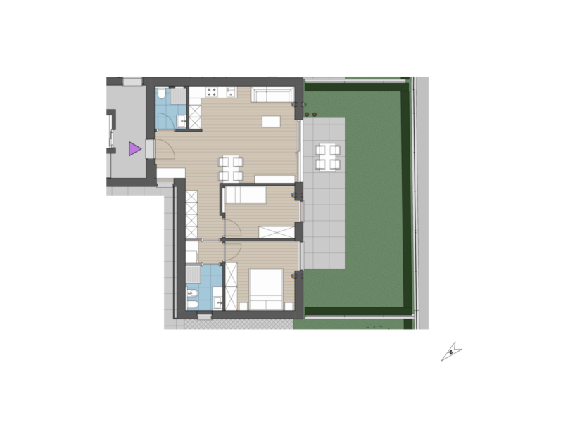 Diese einladende Wohnung befindet sich im Erdgeschoss eines modernen Neubaus in Meran. Sie überzeugt durch ein gut strukturiertes Raumkonzept mit fließendem Übergang zwischen Wohn- und Schlafbereich. Der helle Wohnraum mit integrierter Küche öffnet sich direkt zur großzügigen Terrasse mit privatem Garten und schafft ein angenehmes Wohngefühl im Grünen. Weiters besteht die Wohnung aus zwei Schlafzimmern, ergänzt durch zwei Bäder – eines mit Fenster und Dusche, ein weiteres als Gäste-WC. Große Fensterfronten sorgen für viel Tageslicht, während die ebenerdige Lage mit direktem Zugang zum Außenbereich besonderen Komfort bietet. Die Wohnung liegt in zentrumsnaher, krankenhausnaher Lage mit guter Anbindung an öffentliche Verkehrsmittel und Einkaufsmöglichkeiten. Der Neubau wurde nach dem Standard eines Klimahauses A Nature errichtet. Garagen sind gegen Aufpreis erhältlich, und da es sich um einen Neubau handelt, können persönliche Wünsche bei der Innenausstattung berücksichtigt und das Innere individuell gestaltet werden.