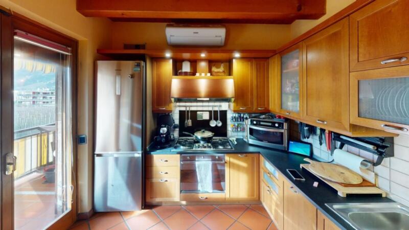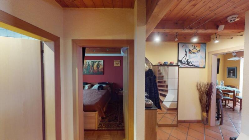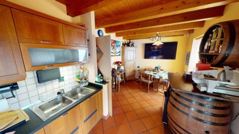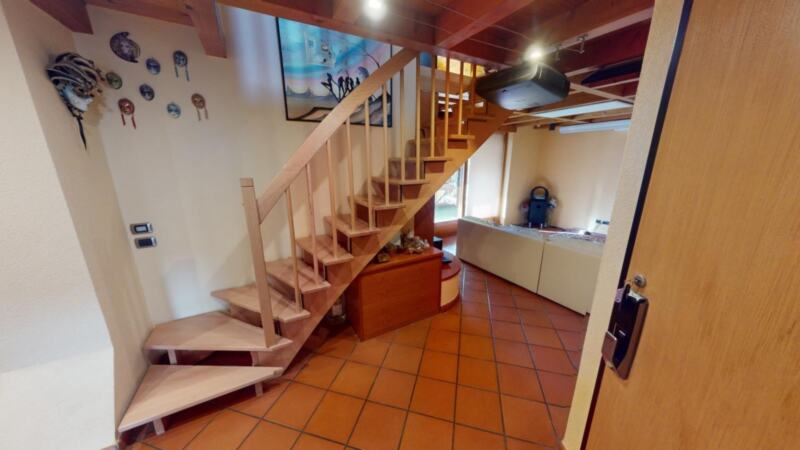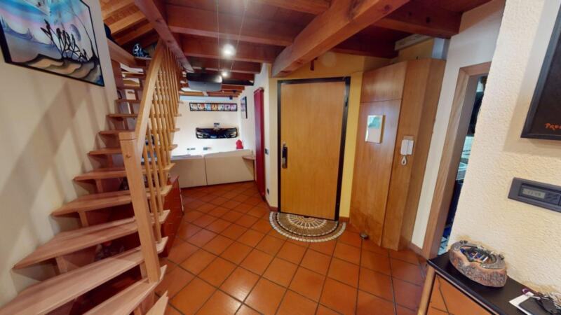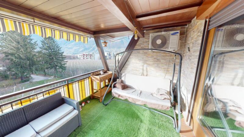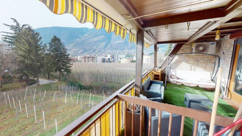 Durch die Eingangstür gelangt man in eine großzügige Diele, die den Zugang zu einem weitläufigen Wohnbereich eröffnet. Eine Panoramafensterfront führt auf die überdachte Terrasse, die zum Entspannen oder für gesellige Aperitifs mit Freunden einlädt – mit einem herrlichen Blick auf die umliegenden Apfelhaine, die für eine sonnige und friedliche Atmosphäre sorgen.