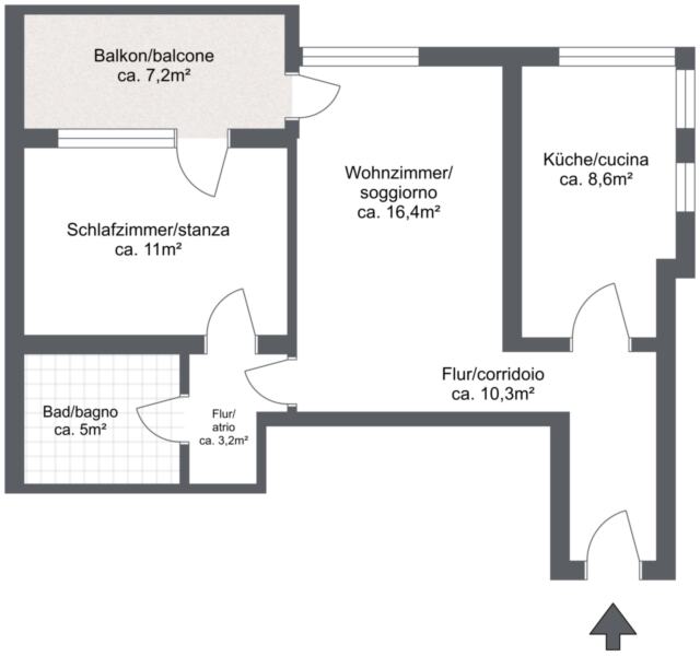 In ruhiger Lage am St.-Vigil-Platz in Meran befindet sich diese gepflegte Zweizimmerwohnung im 1. Stock eines Wohnhauses mit Aufzug.