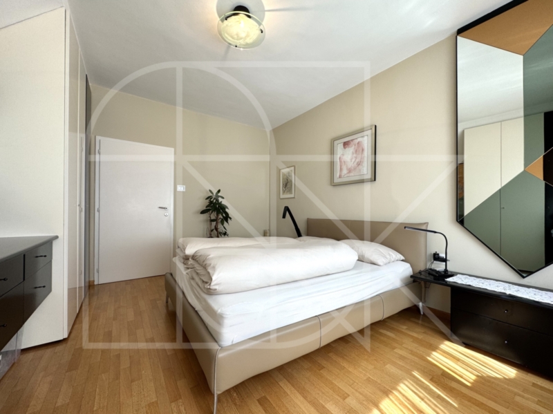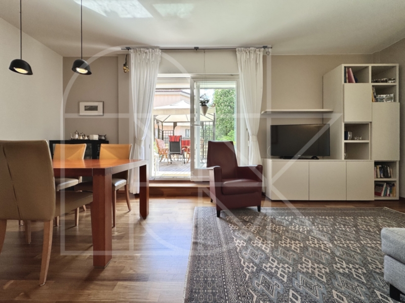 Das Herzstück der Wohnung ist das helle, geräumige Wohnzimmer mit direktem Zugang auf die nach Südwesten ausgerichtete Panoramaterrasse: ein sonnenverwöhnter Rückzugsort mit viel Platz für Lounge- und Essbereiche – urbanes Outdoor-Wohnen auf höchstem Niveau.
