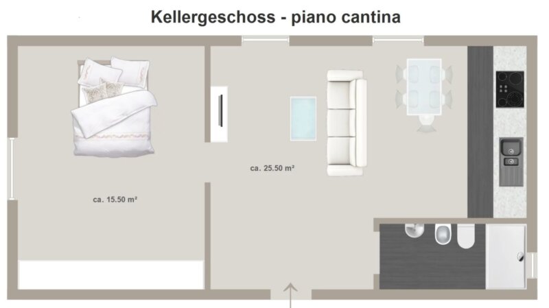 Im Untergeschoss befindet sich ein circa 41,00m² großer Hobbyraum , der als kleines Apartment gestaltet ist und über einen Wohnbereich mit Kochecke, Geschirrspüler und Backofen, ein Schlafzimmer sowie ein Badezimmer mit Fenster, eigener Heizung und Radiatoren verfügt.